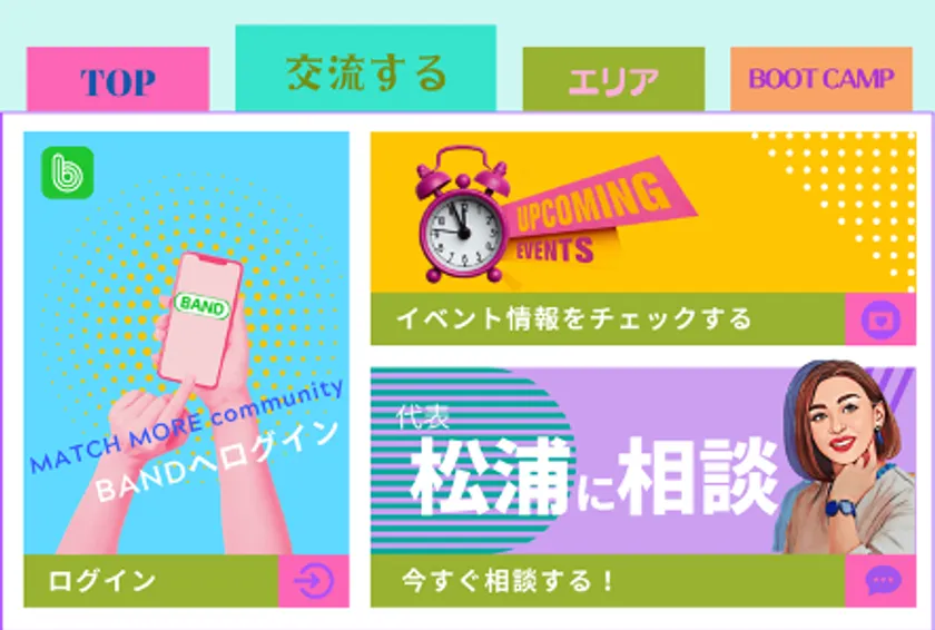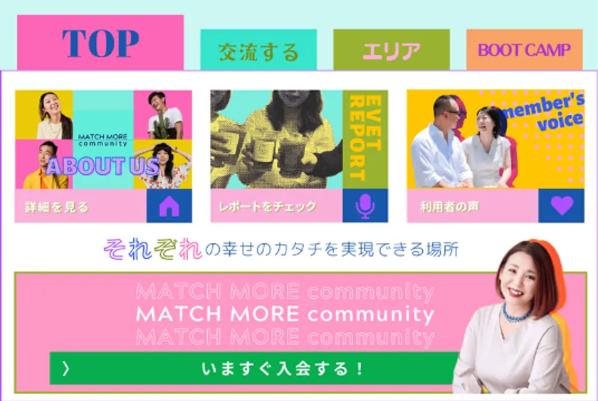多様化する結婚観の中で、事実婚・週末婚・移住婚・友達婚…など、婚活においても個々人が本当に求めるパートナーシップの希望を大切に、これまでの婚活サービスで前提となっていた婚活の[あるべき]にとらわれず、婚活でもウェルビーイングを実現できる場所を提供したい。そんな想いでコミュニティ婚活株式会社が運営するのが、婚活男女のためのコミュニティ「マッチモアコミュニティ」です。現代の結婚希望者へ、交流機会と継続コミュニケーション、体験共有の場を提供する独自のコミュニティ型婚活支援企業です。