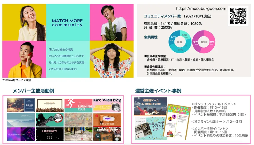 価値観が多様化する一方で婚活は未だコンサバティブな世界です。そんな中生まれたコミュニティによる継続的コミュニケーションでパートナーとの出会いを実現する『マッチモアコミュニティ』は、コロナ禍のサービススタートから2年。多くの方にご好評いただき、自由な婚活の中で今年既に20組以上のパートナーが成立しています。法的入籍による結婚だけでなく、事実婚・別居婚・移住婚・二拠点婚など、さまざまな価値観を持つ利用者との交流で、婚活でもウェルビーイングを叶えられる場所を提供いたします。