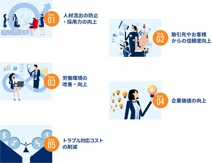 ハラスメント対策を適切に講じることでトラブルを未然に予防し職場環境を改善することは、従業員の士気を高めるだけでなく企業とステークホルダーとの信頼関係の構築に繋がり、社会的信用や企業価値を向上させます。