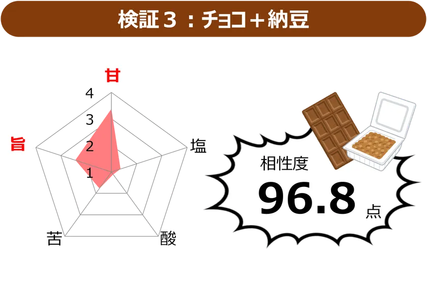 検証の結果、「醤油」「味噌」とチョコレートの組み合わせは、チョコレートと相性の良い代表格である「コーヒー」と同等の美味しい組み合わせであることが判明しました。また、味覚の基本五味のうち「甘味・旨味・塩味」のバランスが整っており、「ハンバーグ」「焼肉」「甘口カレー」などといった、子どもが好む「味覚の王道」を実現していることが分かりました。その結果を踏まえ、同じ大豆由来の発酵食品として「納豆」を検証したところ、「納豆」もチョコレートと相性度が高いことを発見しました。