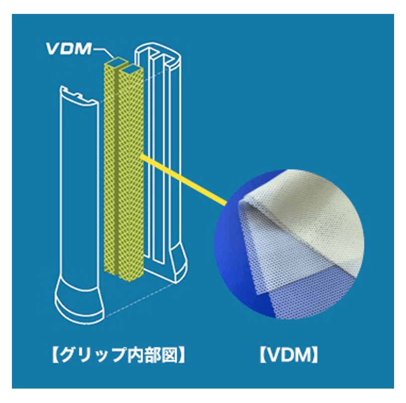特殊なメッシュ状の新振動吸収素材「VDM」をグリップ部に内蔵。従来素材よりも広範囲にわたって使用することで、打ち負けない衝撃吸収性を実現しました。