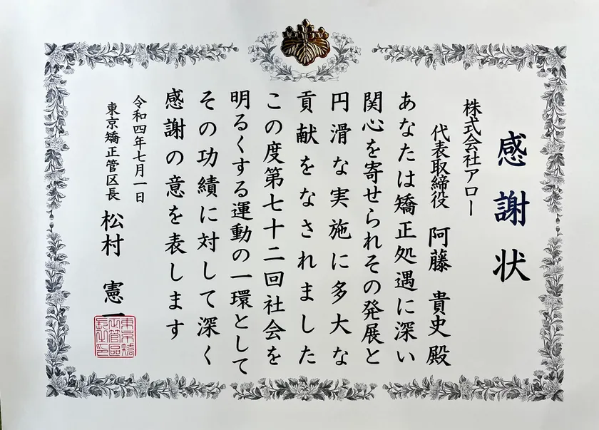 理学療法士による、インフォーマルサービスの提供を行う株式会社アロー(本社:東京都世田谷区、代表取締役:阿藤 貴史)は、矯正処遇の発展と円滑な実施に多大な貢献をしたとして、2022年7月25日に府中刑務所にて、松村 憲一東京矯正管区長より感謝状が授与されました。