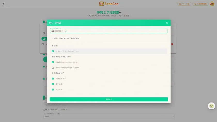 TOPページから「仲間と予定調整」を選択。頻繁に予定調整するメンバーのカレンダーにチェックを入れ(事前にカレンダーの登録が必要)グループを作成。