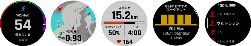 左から、トレイルランVO2 Max、NextForkマップガイド、リアルタイムスタミナ、おすすめワークアウト、アクティビティ機能