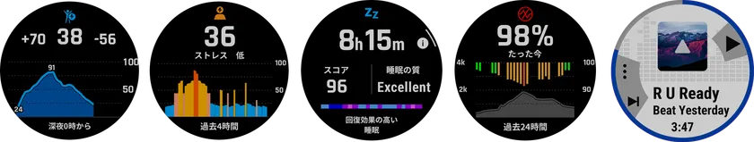 左から、Body Battery、ストレススコア、睡眠スコア、血中酸素トラッキング、音楽再生機能