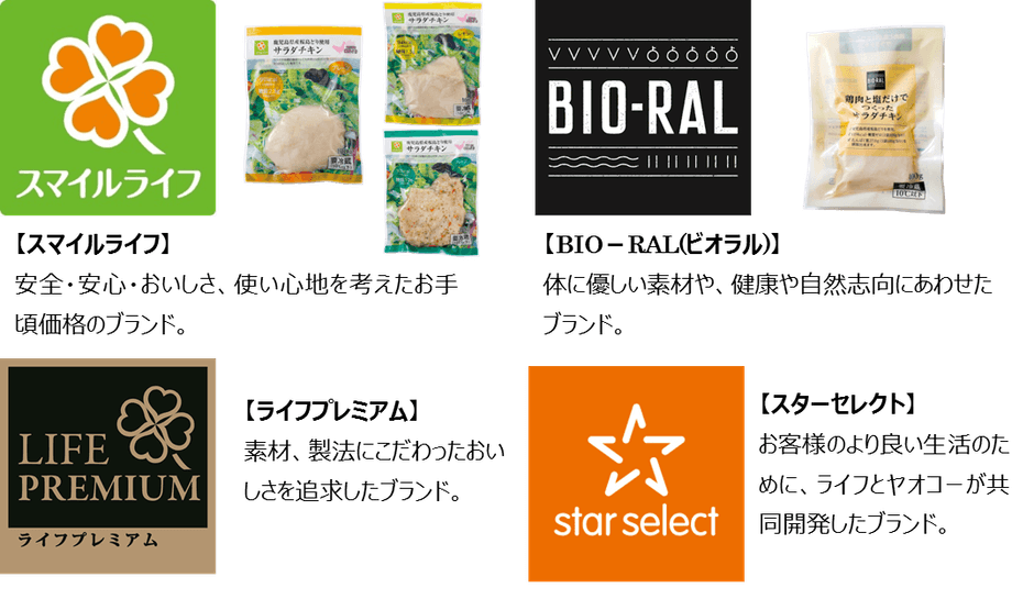 4つのプライベートブランドより、お手頃価格のものや、高品質・健康や環境に配慮した商品まで、約1,600種類を展開しております。1つのお店に4種類のプライベートブランドがそろっているので、用途や気分によって気軽に使い分けることができるのがライフのプライベートブランドの特徴です。