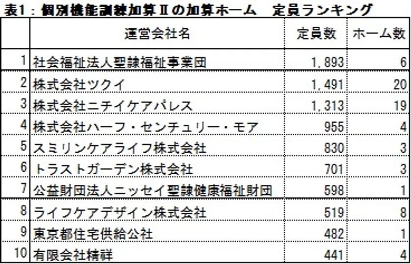 表1:個別機能訓練加算IIの加算ホーム 定員ランキング