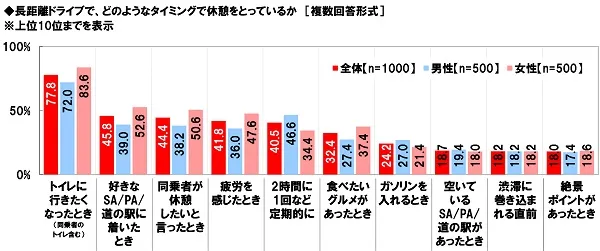 ■長距離ドライブでの休憩タイミング 1位「トイレに行きたくなったとき」2位「好きなSA/PA/道の駅に着いたとき」