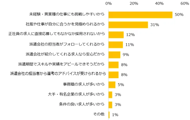 「紹介予定派遣を利用して正社員になりたいと思いますか?」と伺うと、44%が「紹介予定派遣を利用して、正社員になりたい」と回答しました。あわせて理由を質問すると「未経験・異業種の仕事にも挑戦しやすいから」(50%)、「社風や仕事が自分に合うかを見極められるから」(31%)が上位でした。