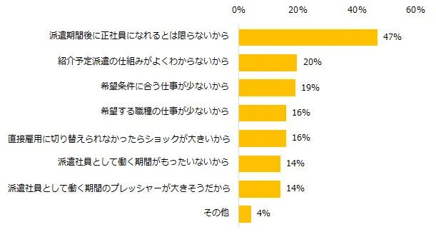 「正社員にはなりたいが、紹介予定派遣は利用したくない」と回答した方に理由を伺うと、トップは「派遣期間後に正社員になれるとは限らないから」(47%)でした。次いで、「紹介予定派遣の仕組みがよくわからないから」(20%)、「希望条件に合う仕事が少ないから」(19%)が続きました。正社員になれるかどうか、不安を感じている方が多いことがわかります。具体的なコメントもあわせて紹介します。