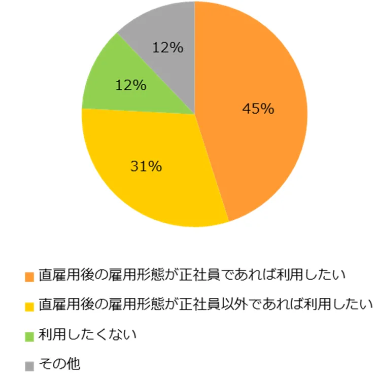 紹介予定派遣の経験者に「今後、お仕事探しの際にまた紹介予定派遣を利用したいと思いますか?」と伺うと、約8割が「利用したい」(直雇用後の雇用形態が正社員であれば利用したい:45%、直雇用後の雇用形態が正社員以外であれば利用したい:31%)と回答しました。