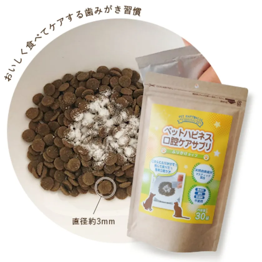 歯ブラシを怖がる・口に触れるのを嫌がる、歯磨きが苦手なわんちゃんのための、食べて口腔ケアができるふりかけタイプのサプリメント。いつものごはんやおやつにふりかけて食べるだけなので、わんちゃんにも飼い主さんにも負担が少なく口腔ケアを続けられます。天然成分「マスティック」配合。