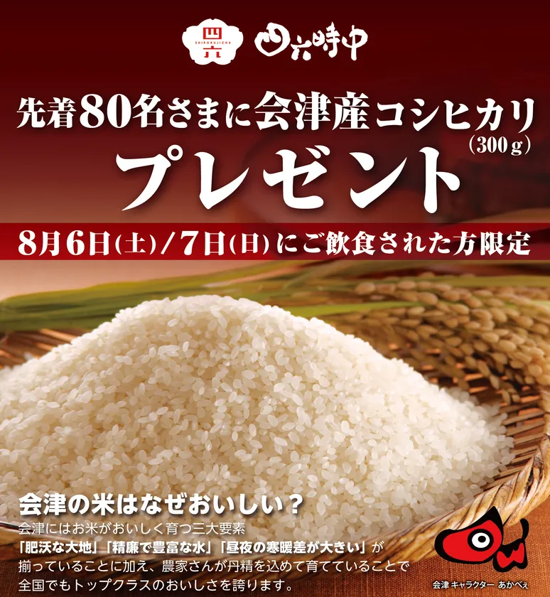 この度、イオンモール津田沼店「会津フェスタ2022」開催(※2)を記念して『会津若松市×四六時中』の合同企画として千葉県内の『四六時中』14店舗で8月6日(土)~7日(日)の2日間ご飲食された各日先着80名さま(合計160名)に「会津産コシヒカリ(300g)」をプレゼントいたします。是非この機会に「会津産コシヒカリ」の美味しさと当店メニューをより多くのお客さまに楽しんでいただきたいと考えております。