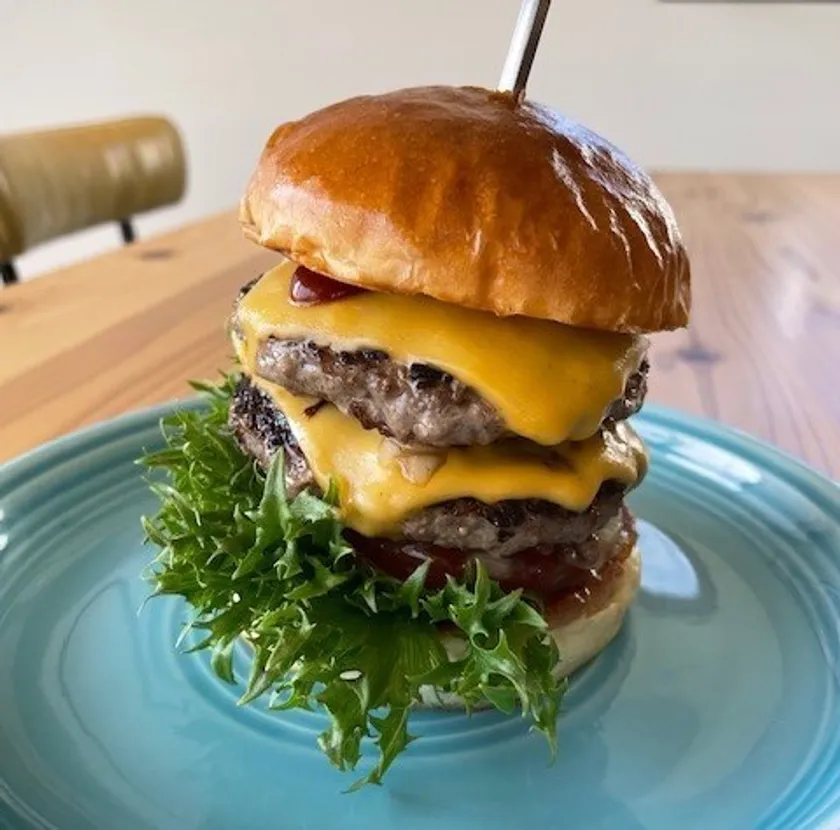 2階テラス席から眺める太平洋の雄大な景色は格別です。お店のメインは、千葉県産牛肉100%を使用した肉厚のハンバーガー。麻布のフレンチで腕を磨いたオーナーシェフがつくるハンバーガーは野菜や卵、豚、スモークレバーなど地域の食材をふんだんに盛り込んだ絶品の味!カリッと焼いたバンズが美味しさを一層引き立たせます!種類も10種類以上と豊富で全てお持ち帰りも可能なので、ビーチなどで食べるのもオススメです。