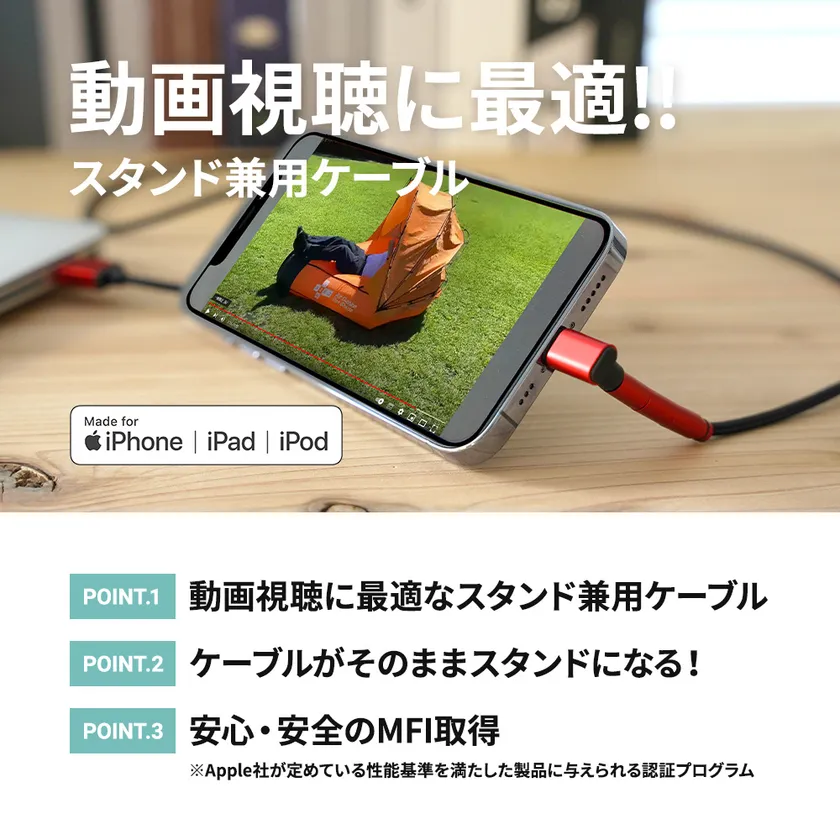 ケーブルがそのままスタンドになる!Lightningケーブル 最適な角度調整ができるから動画視聴に最適! L字型角度可変スタンドLightningケーブル 販売開始