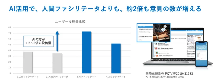 AIファシリテーションが引き出す意見は、人間比の2倍という検証結果も出ています。D-Agreeは、国内の教育機関や行政、また海外でも導入が加速しています。