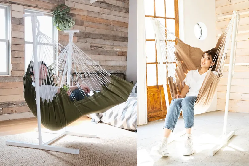一人でゆっくりくつろげるチェア型ハンモックなら、1畳にも満たない省スペースでお部屋の一角が極上の癒し空間に。