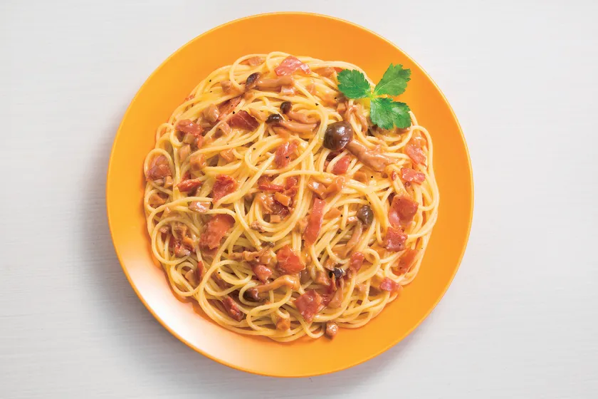 また、バターたっぷりのリッチな味わいに醤油でアクセントを加え、人気の和風味に仕上げました。ベーコンとぶなしめじで具材感もあり、食べ応えがあります。