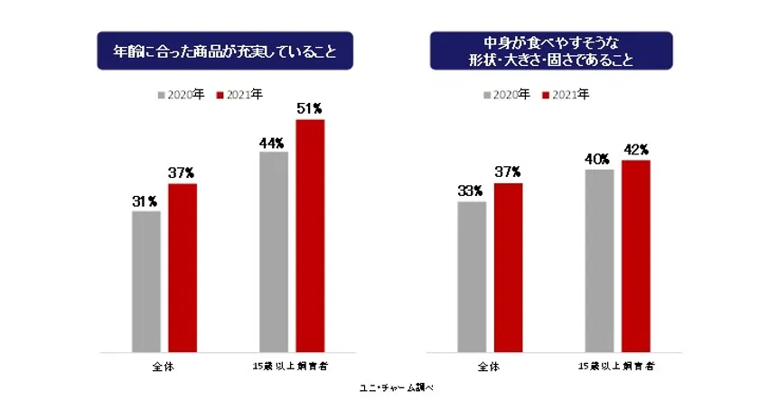 ネコちゃんが高齢になるほど、「年齢にあった商品」や「中身が食べやすい形状・大きさ」などについて重視度が高まります。