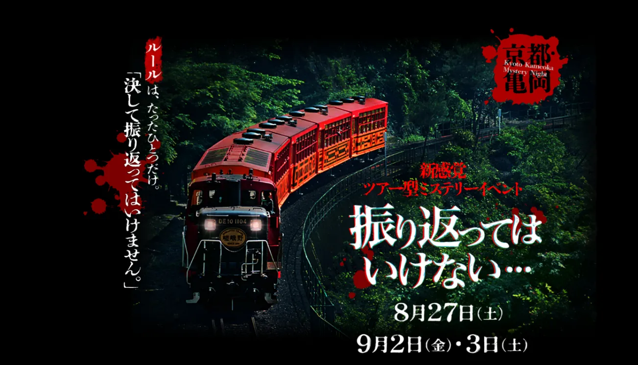 京阪京都交通株式会社(本社:京都府亀岡市、社長:阪本和宏)は、嵯峨野観光鉄道株式会社(本社:京都府京都市、社長:井上敬章)と連携し、亀岡市の新たな夜のイベントとして嵯峨野観光鉄道「トロッコ嵯峨駅」を出発地点とした新感覚ツアー型ミステリーイベント「京都・亀岡ミステリーナイト 振り返ってはいけない」を開催します。嵯峨野観光鉄道のトロッコ列車で亀岡に訪れた参加者に、ホラー仕立てのバスで周遊いただけます。目隠しをして乗り込んだバスの車内では、不気味な体験が待っています。そして最後はある会場に皆様を連れていきます。