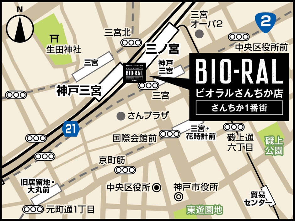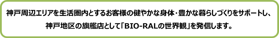 神戸市の中心地であり、商業施設やオフィスビルが立ち並び、観光スポットとしても人気の「三宮」エリアで、「オーガニック・ローカル・ヘルシー・サステナブル」のコンセプトに沿って、食品添加物や健康、素材に配慮した約4,000種類の商品を取りそろえ、お客様の心と体の健康と豊かな日々をお手伝いするとともに、持続可能で豊かな社会の実現に貢献いたします。