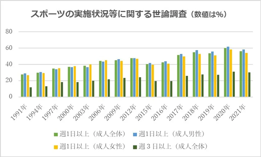 スポーツ庁が毎年実施している「スポーツの実施状況等に関する世論調査」によると、最初の緊急事態宣言が出されるなど、新型コロナウイルス感染症が急速に広がった2020年は、週1日以上運動する人の割合が、調査データを比較できる1991年以降で最高を記録。2021年の調査では若干減ったものの、依然としてコロナ前より高い数字となっています※。中でも特に、密を避けての「ウォーキング」や屋内での「体操」「トレーニング」といった、コロナ禍でもできる運動を始める人が増えています。