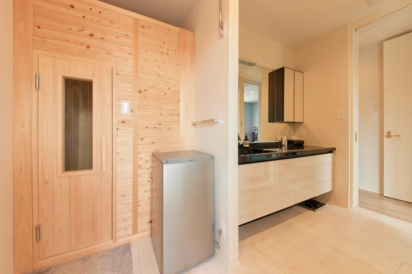 「家族全員、温泉が大好きなので、大きな窓でバルコニーと一体になった、露天風呂感覚を味わえるお風呂にしました。その隣をトレーニングルームにして、汗をかいたらそのままお風呂に直行できるように。サウナもお風呂のすぐ前にあるので、すぐ水風呂に入ったり、シャワーを浴びてバルコニーで外気浴できるようにしました。設計担当者が動線を考え抜いてくれたので、ものすごく使いやすいです。」