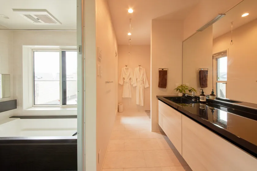 浴室、洗面室、奥にサウナとバルコニーと、動線を考えた配置に