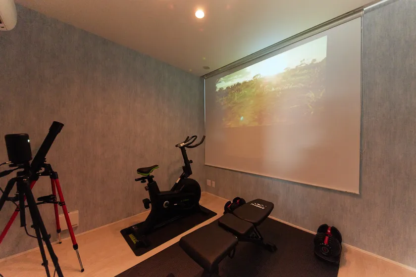 トレーニングルームのロールカーテンはスクリーンにもなり、映画を楽しむことも