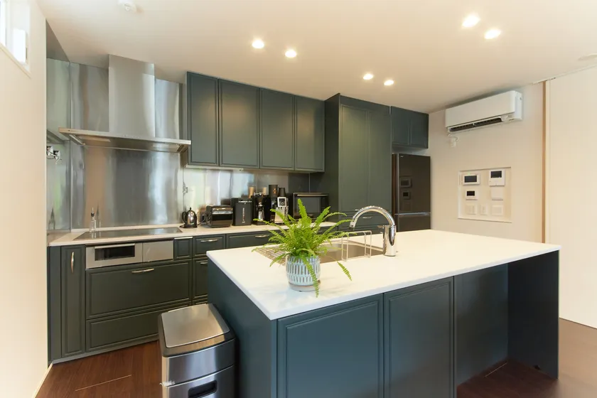 特徴的な「框組の扉」に惚れ込んでオーダーした深みのある緑を基調にしたアイランドキッチン