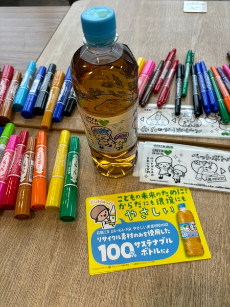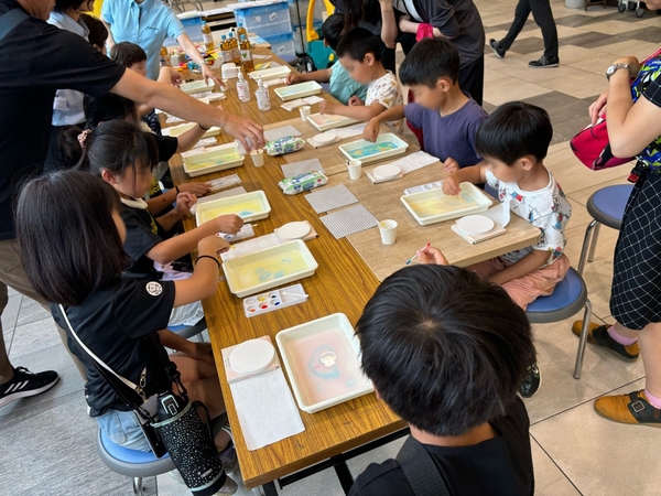 サントリーからは、オリジナルラベルを作るぬりえイベントを実施し、正しいリサイクルについて学んでいただきました。水のワークショップとしては、森の働きについて学んでいただき、八戸ノ里店限定で、水に絵具を浮かせて作るオリジナルコースター作り体験も実施しました。