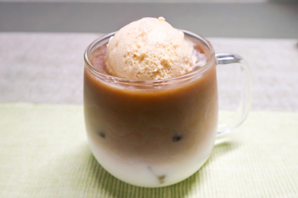 1.グラスに氷とアイスコーヒー、牛乳を入れます。