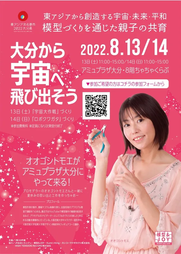 株式会社臼杵屋(大分県大分市、代表取締役:足立篤志)は、JR大分駅の複合商業施設アミュプラザおおいたにて2022年8月13日(土)〜14日(日)に行われるイベント「東アジアから創造する宇宙・未来・平和 ~模型作りを通じた親子の共育~」にて、模型やジオラマ制作を通じて宇宙や模型文化の魅力を伝えるための親子で参加できる工作講座を開催します。講座では、全国のプラモデル教室などで講師を務めるオオゴシトモエさんが講師をつとめます。また当日は、大分県内の大学の留学生にも協力いただき、今回の模型・ジオラマ製作のテーマでもある「宇宙・未来・平和」の表現による文化交流の機会を提供します。
