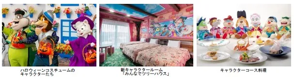 3日間限定で、ハロウィーンコスチュームに身を包んだキャラクターたちと一緒にキャラクターショー「パティオ デル カント」のステージで記念撮影ができる「ハロウィーン特別フォトセッション」を実施します(有料)。さらに10組限定で、フォトセッション撮影券と新キャラクタールーム「みんなでツリーハウス」の宿泊がセットになった特別宿泊プランを販売します。キャラクターたちと一緒に志摩スペイン村で特別なハロウィーンをお楽しみください。