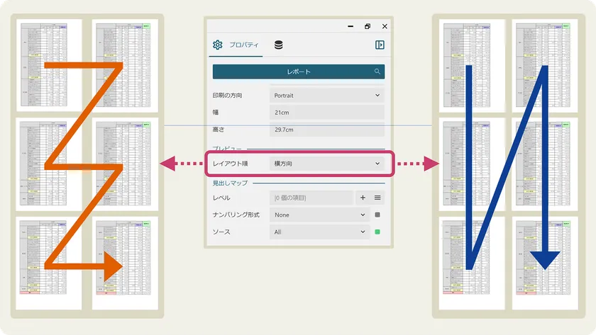 また、クロス集計表を作成できるTablixコントロールにおいて、複数ページにまたがり出力する際の改ページ方向の変更が可能となりました。用途に合わせて、「左から右」または「上から下」のいずれかを選択できます。