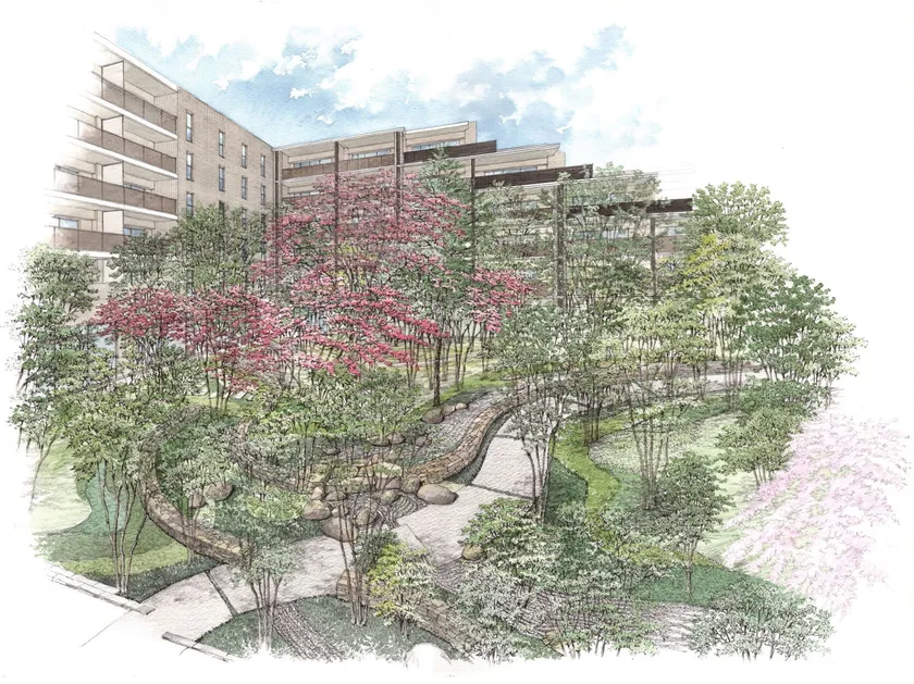 積水ハウスは、東急田園都市線「溝の口」駅徒歩12分、JR南武線「武蔵溝ノ口」駅徒歩11分に位置し、駅前の賑わいとは一線を画した住宅エリアである川崎市高津区久本三丁目に総戸数123戸のプロジェクトを始動させます。本物件は四季折々の表情を見せる緑豊かな中庭を設け、街の利便性を享受しながら、自然を“日常”として身近に感じられる住まいを提供。また中庭の魅力を享受できる個別ブースも構えた在宅ワーク可能なラウンジを計画しています。