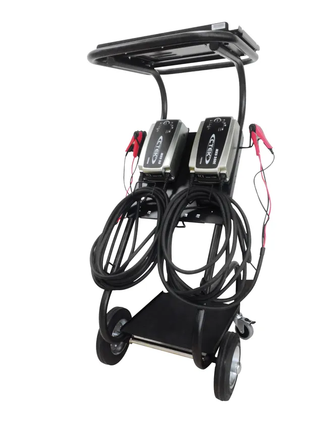 高性能バッテリー充電器セット「WHCT 12/24V」は、プロユース向け充電器で国内でも実績を誇る「MXS25EC」2台とCTEK充電器、診断機などを一緒に持ち運ぶことができる作業台「TROLLEY PRO(トロリープロ)」をセット。12V/24Vバッテリーをフルオート充電可能なシステムです。