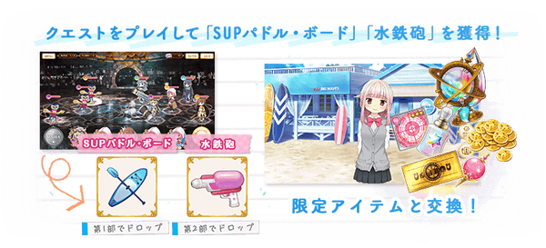 APを消費し、本イベントのクエストをプレイすることでイベント限定ショップで交換に使えるアイテム「SUPパドル・ボード」「水鉄砲」や特定のクエストを解放できるフラグメントを獲得できます。