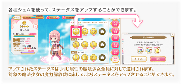 「属性強化」とは、属性強化ジェムと各属性のジェム++、マスタージェム++等のアイテムを使用して魔法少女のステータスをアップさせる機能です。