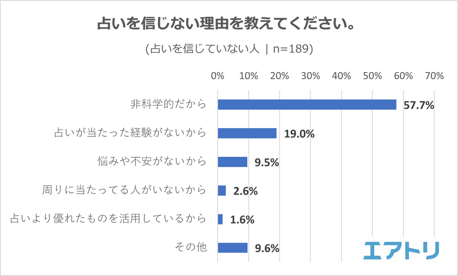 占いを信じていない人に信じない理由を聞いたところ、「非科学的だから」と回答した人は57.7%、次いで「占いが当たった経験がないから」が19.0%、「悩みや不安がないから」が9.5%でした。