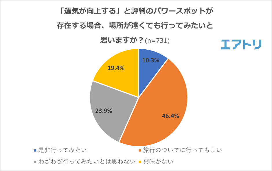 「旅行のついでに行ってもよい(46.4%)」、「是非行ってみたい(10.3%)」と合わせるとパワースポットに「行ってみたい人」は56.7%と、運気アップやご利益のあるパワースポットへの来訪も、旅行の目的の一つになる人が多くいることが分かりました。