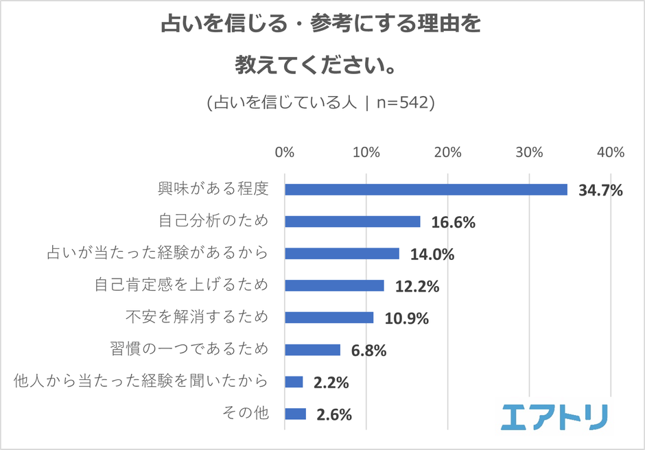 占いを信じている人に理由を聞いたところ、「興味がある程度(34.7%)」、「自己分析のため(16.6%)」、「占いが当たった経験があるから(14.0%)」の順になりました。