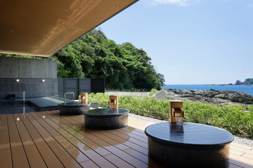 自転車を折りたたまずに乗り入れることができる電車「サイクルトレイン」を利用してサイクリングを楽しみ、「望海のゆ」に辿り着くと、絶景の枯木灘(かれきなだ)海岸(かいがん)を眺めながら入浴することができます。