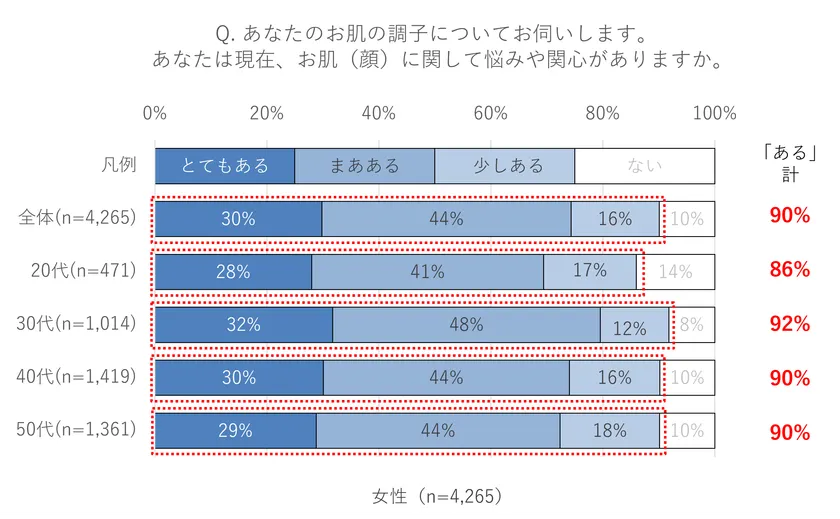 「あなたは現在、お肌(顔)に関して悩みや関心がありますか。」という問いに、各年代の約9割の方が『とてもある・まあある・少しある』と回答しました。
