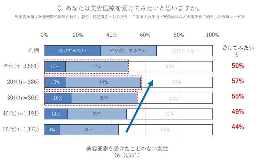 美容医療を受けたことのない女性に対し、「あなたは美容医療を受けてみたいと思いますか。」という問いをした結果、美容医療を『受けてみたい・やや受けてみたい』と回答した割合は5割、利用意向が最も高いのは20代で57%となりました。年代が若いほど意向が高い傾向がみられています。