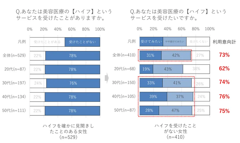 ハイフ認知者に対して、「あなたは美容医療の【ハイフ】というサービスを受けたことがありますか。」という問いをしたところ、ハイフを受けたことがない割合は全体で78%存在。さらに、ハイフを受けたことがない方に「あなたは美容医療の【ハイフ】というサービスを受けたいですか。」という問いをすると、全体の73%が『受けてみたい・やや受けてみたい』と回答し、特に30-50代の利用意向が高い結果となりました。