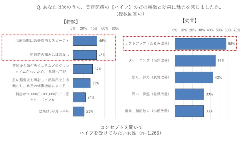 ◇ハイフ未認知者が感じるハイフの魅力は『施術時間の速さ』『施術中の痛みの少なさ』『ダウンタイムがほぼ無いこと』。期待される効果として、リフトアップ(たるみ改善)・毛穴改善が期待できるタイトニング効果に多く期待が寄せられる結果に。