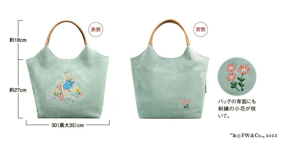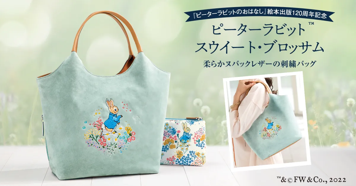 『ピーターラビットのおはなし』絵本出版120周年記念。<ピーターラビット(TM) スウィート・ブロッサム>柔らかヌバックレザーの刺繍バッグ新発売!