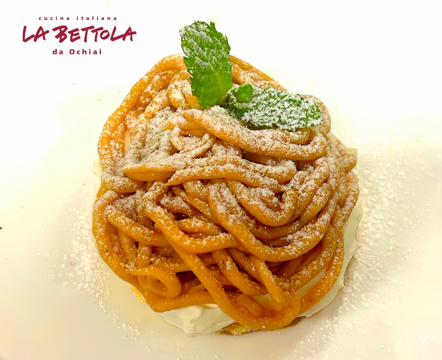 “本物のイタリア料理”を堪能できるお店として東京・銀座で25年以上にわたって人気を博す名店「LA BETTOLA da Ochiai(ラ・ベットラ・ダ・オチアイ)」からは「ズワイガニ入り カラスミの冷製カペッリーニ」と特製ドルチェ「モンテビアンコ」&「プリン」。