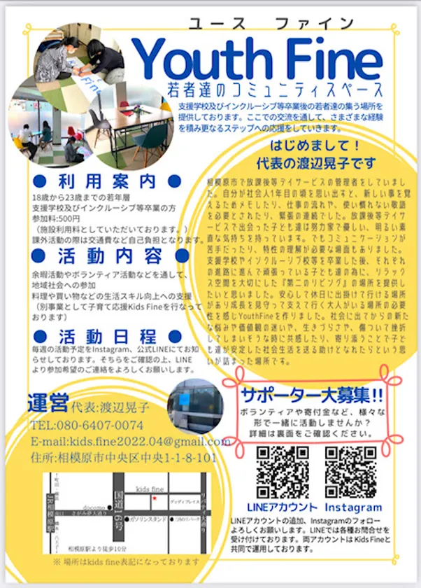 Youth Fineは休日に同じ場所で開所しています。利用は18歳から23歳までの支援学校やインクルーシブ校を卒業した方です。卒業後に安心して休日に出かけられる場所があり成長を見守って支えてくれる大人がいるコミュニティスペースです。安定した社会生活を送る助けとなることを目的にしています。